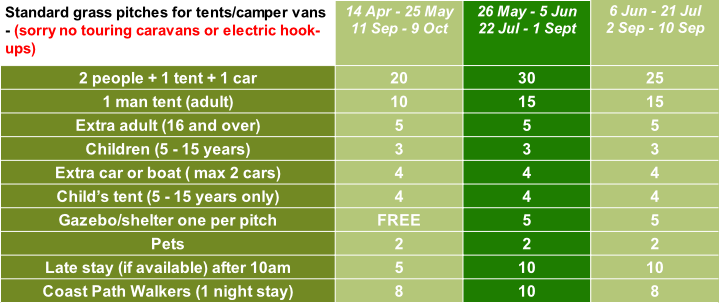 We are fully licensed for tents and motor-homes (sorry no hook-ups) and welcome families/couples and coast path walkers only.