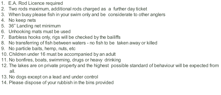 Please either take your rubbish home with you (preferred option) or use the bins provided, but be aware these could be a route of cross-contamination. All usual fishing rules apply and are displayed at the top of the track.
